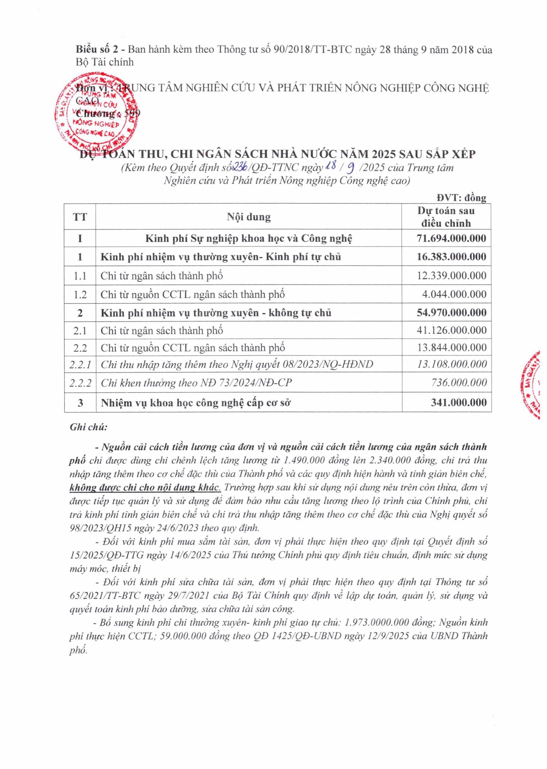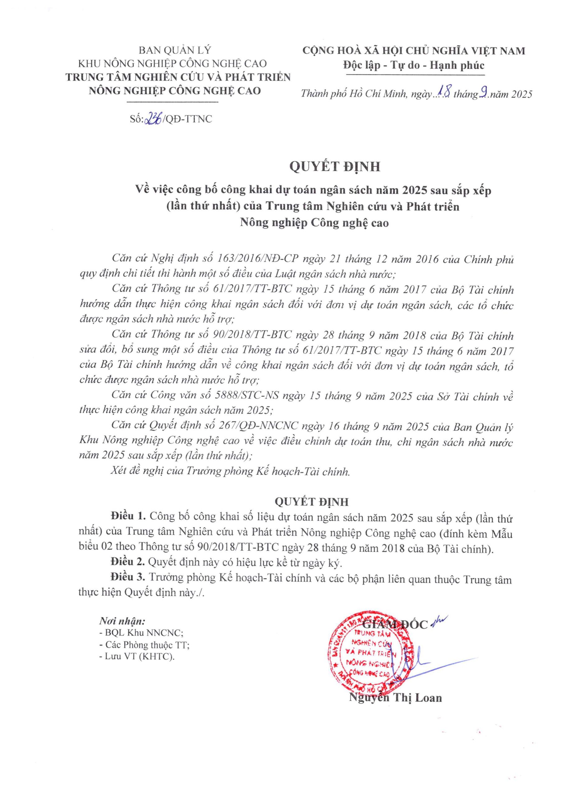 Tin tứcQuyết định về việc công bố công khai dự toán ngân sách năm 2025 sau sắp xếp (lần thứ nhất) của Trung tâm Nghiên cứu và Phát triển Nông nghiệp Công nghệ cao